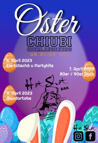 An den Ostertagen haben wir jeden Abend ein «festliches» Programm für euch zusammengestellt. Da würden sogar die Hasen mit ihren Ohren wackeln! Wir freuen uns auf viele Gäste in der Hot Shot Bar.
